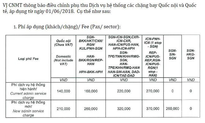 Với các đường bay quốc nội, giá phí sẽ tăng từ 140.000 đồng/vé lên 210.000 đồng/vé. Một vài chặng bay từ Hà Nội và TP.HCM đến các điểm đến trong khu vực đều tăng phí quản trị hệ thống thêm 100.000 đồng/vé, lên mức 260.000-370.000 đồng/vé.