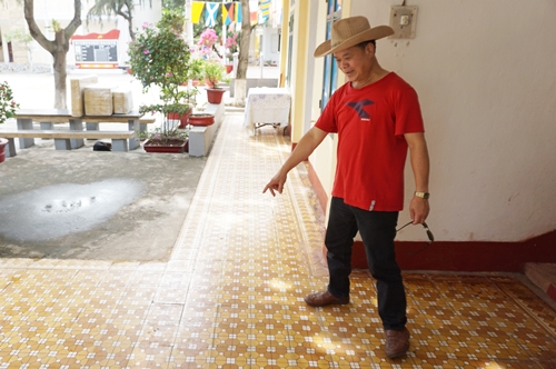 Ông Việt chỉ những viên gạch trong ngôi nhà cũ ở đảo Sơn Ca. Ảnh: Trọng Giáp