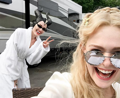 Ngày 29/5, Elle Fanning chia sẻ những hình ảnh hậu trường khi khởi quay Maleficent 2. Angelina Jolie có cách tạo dáng tinh nghịch, đùa vui khác hẳn hình ảnh thường thấy. Cô lấp ló phía sau Elle Fanning khi người đẹp đang chụp ảnh selfie.