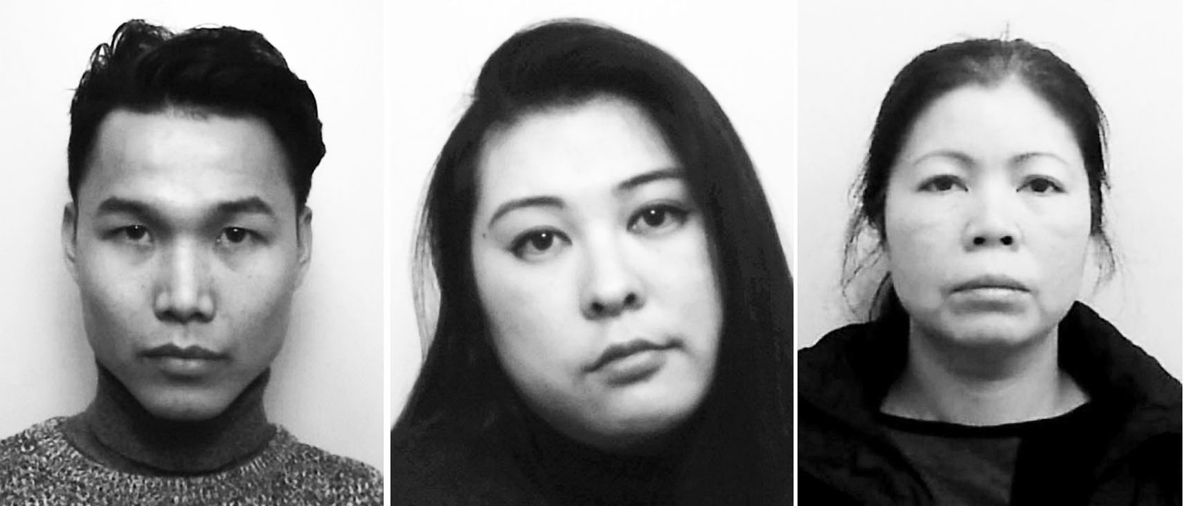 Từ bên trái là Nguyễn Hoàng Việt, Trần Hương Giang, và Nguyễn Thu Hương. Ông Việt bị bốn năm tù, bà Giang bị hai năm tù treo, còn bà Hương bị năm năm tù, sau khi cảnh sát bố ráp các tiệm nail của họ bị nghi là cơ sở trá hình cho hoạt động buôn người và buôn ma túy. (South West News Service)