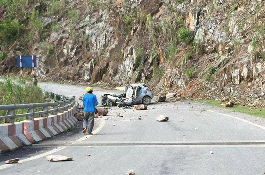 Đang đỗ ven đường, chiếc xe 4 chỗ đã bất ngờ bị một tảng đá lăn đè bẹp. Vụ tai nạn đáng tiếc đã khiến tài xế tử vong tại chỗ và 2 người khác bị thương.