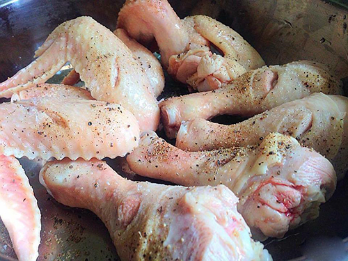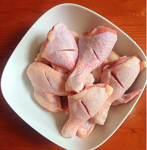 - Cánh và đùi gà rửa sạch, khía nhẹ rồi nhúng vào nước sôi 3-4 phút, vớt ra để ráo.