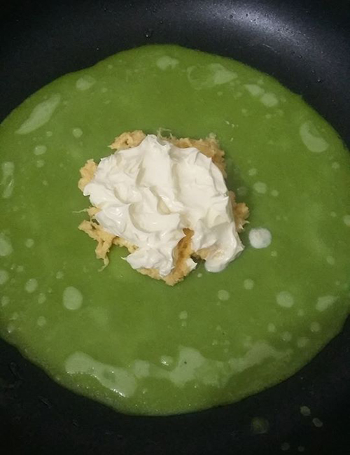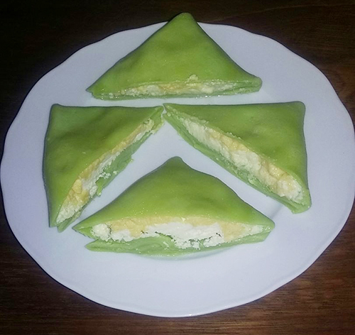 - Tráng ít dầu ăn vào chảo chống dính, dùng vá nhỏ múc bột tráng như tráng trứng. Canh khoảng vài phút bột chuyển màu xanh đậm là chín. Nhắc xuống để nguội bớt sau đó nhẹ nhàng lấy bánh ra đĩa (lấy theo kiểu cuốn chiếu vì bột rất mềm dễ vỡ, phải nhẹ nhàng). Lấy ra xong thì mở bánh ra thành hình tròn, cứ lần lượt tráng cho hết bột.