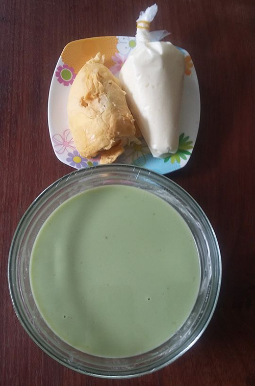 - Đập trứng vào tô lớn, cho sữa tươi, cốt dừa, nước lá dứa và đường vào. Dùng phới khuấy đều nguyên liệu, sau đó cho bột mì vào quậy cho tan. Dùng rây lược lại hỗn hợp, sau đó dùng màng bọc thực phẩm bọc lại cho vào ngăn mát tủ lạnh 30 phút.