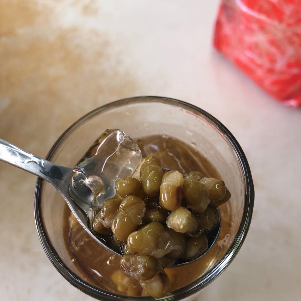 Đậu xanh chín đều, không nở bung, nổi trên mặt nước đường.