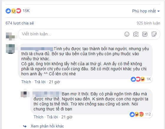Cùng tình cảnh trên, thành viên Ngọc Trà chia sẻ câu chuyện của chính người thân trong gia đình: “Cô chú mình 9 năm lấy nhau chưa có con. Đến năm thứ 10 thì có cô con gái đặt tên là Mười luôn. Chú nói dù con nhận con nuôi chứ không bao giờ lấy vợ hai, đến năm thứ mười thì viên mãn rồi. Trách phận mỏng nhưng thôi rồi sẽ có người yêu thương chị hơn”.