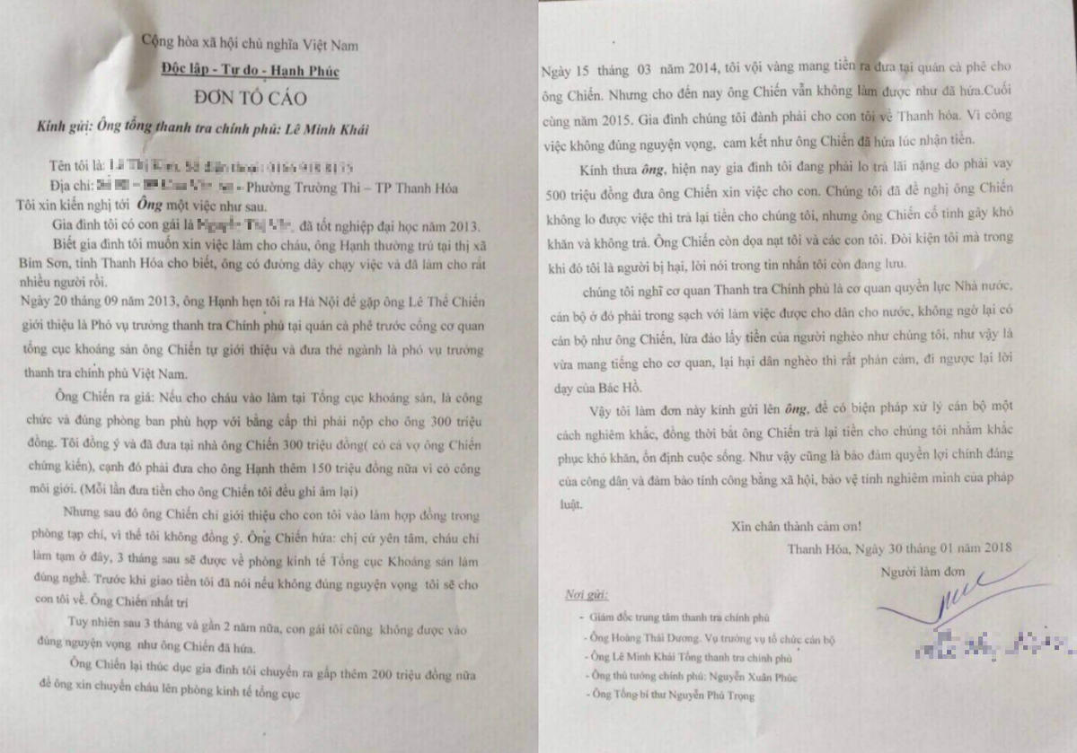 Theo đơn của bà L.T.K (ngụ phường Trường Thi, thành phố Thanh Hóa) là một trong những người tố cáo, bà gặp ông Chiến nhờ một người đồng hương giới thiệu, mục đích chạy việc cho con gái mới ra trường. Theo lời hứa hẹn, con gái bà sẽ được vào làm công chức ở Tổng cục khoáng sản nên bà chi tổng cộng 650 triệu đồng.