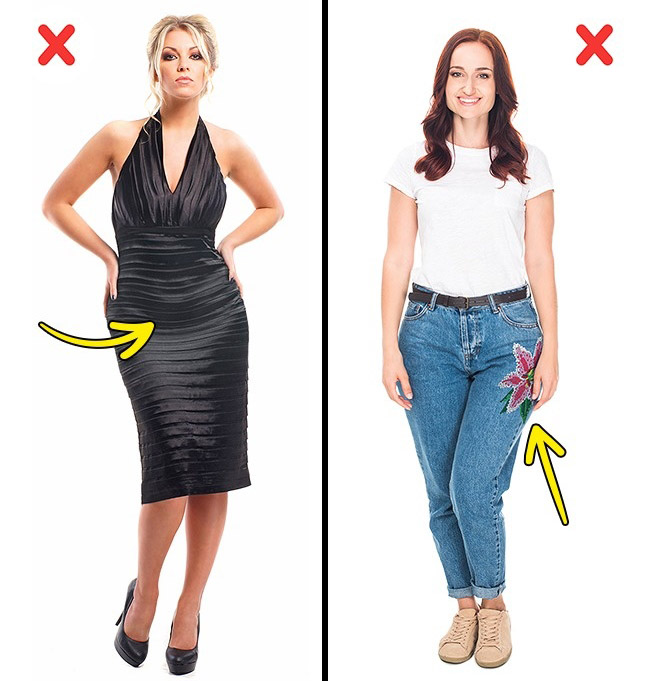 Nếu bạn có vòng eo không mấy nhỏ nhắn, hãy ưu tiên thiết kế peplum hoặc xếp nếp khéo léo thay vì váy bó lộ bụng. Còn trường hợp đùi to, đừng diện quần có túi nổi hay họa tiết bắt mắt ở khu vực bạn muốn giấu đi.