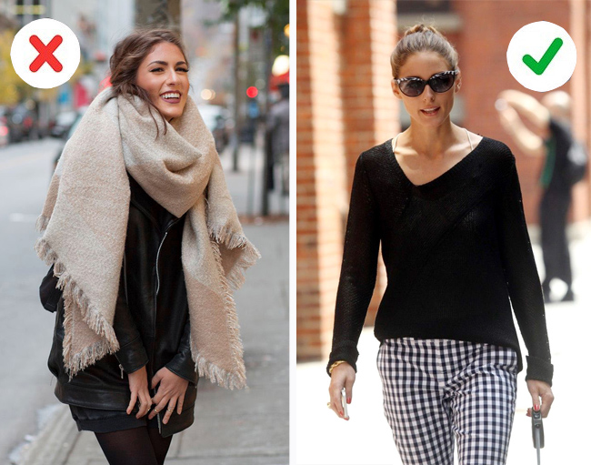 Khăn bản lớn và dày sẽ che lấp phần cổ, làm bạn trông nặng nề. Ngược lại, những mẫu áo cổ chữ V giúp chủ nhân mảnh mai hơn.