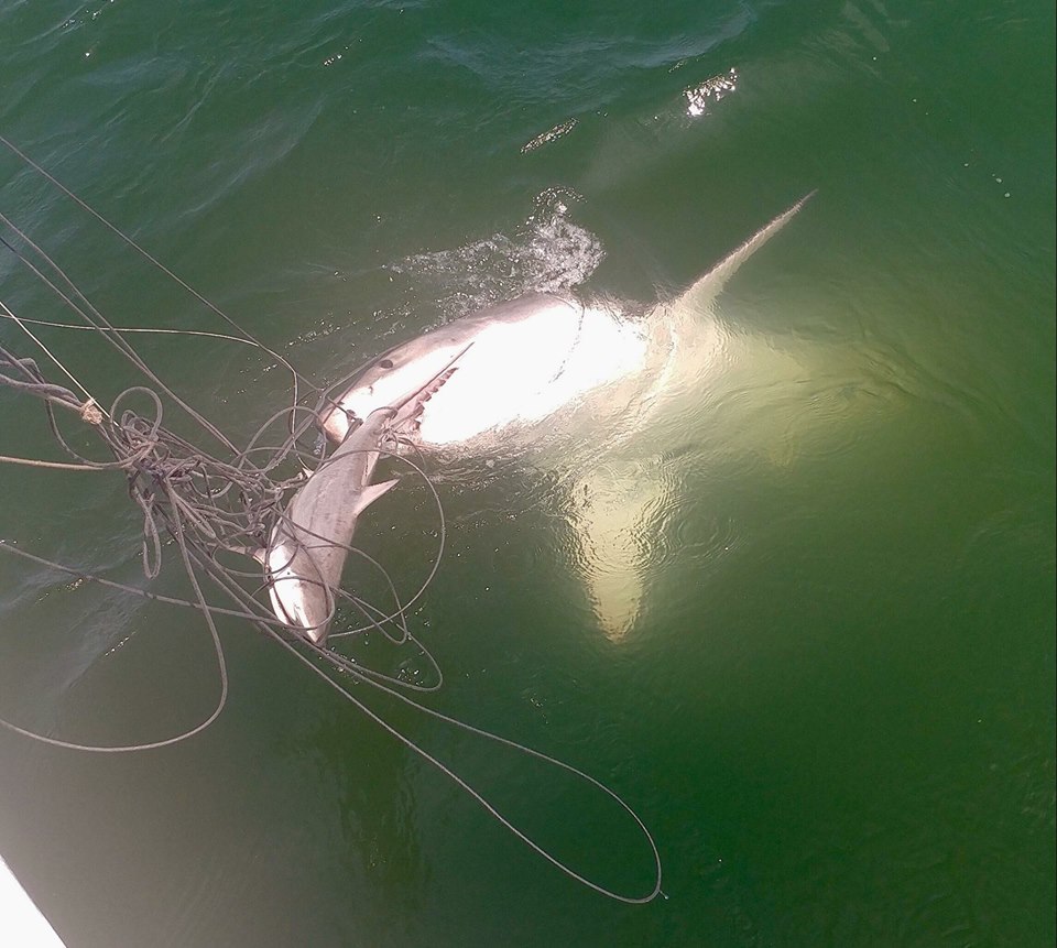 Các nhà nghiên cứu đã khá thích thú khi bắt được một con cá mập đen. Điều thú vị hơn cả là, một con cá mập trắng dài hơn 4m đã cố ăn thịt con cá mập này. Chính vì điều này đã khiến chiếc dây câu bị rối tung lên.