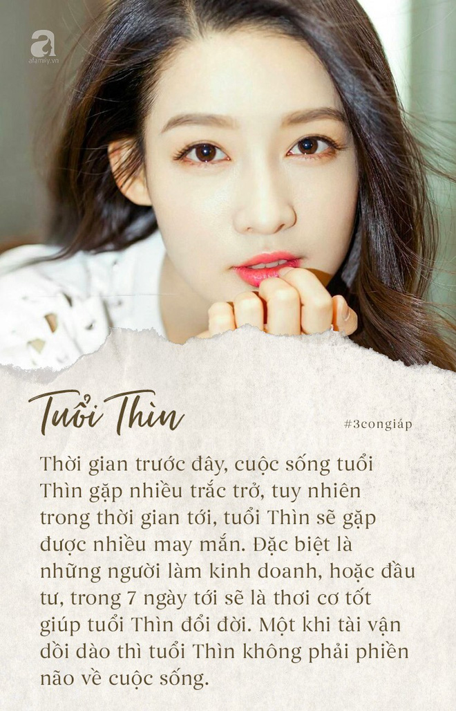 Thời gian trước đây, cuộc sống tuổi Thìn gặp nhiều trắc trở, tuy nhiên trong thời gian tới, tuổi Thìn sẽ gặp được nhiều may mắn. Đặc biệt là những người làm kinh doanh, hoặc đầu tư, trong 7 ngày tới sẽ là thơi cơ tốt giúp tuổi Thìn đổi đời. Một khi tài vận dồi dào thì tuổi Thìn không phải phiền não về cuộc sống. Bên cạnh đó, vận may sẽ giúp sự nghiệp tuổi Thìn không những vững chắc ổn định mà gia đình còn êm ấm hạnh phúc.