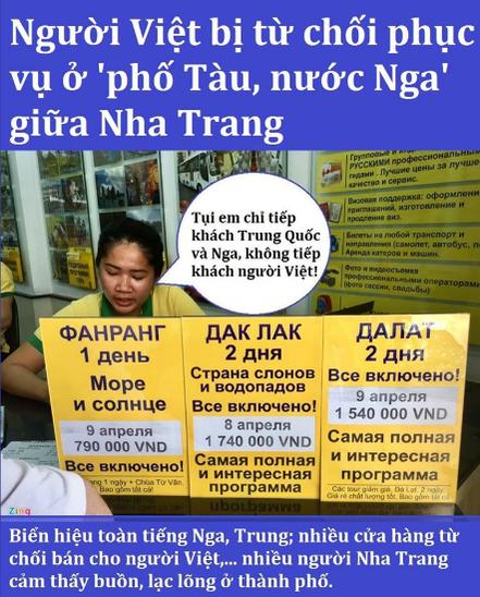 Người Việt bị từ chối phục vụ ở ‘phố Tàu, nước Nga’ giữa Nha Trang. Những nơi này để biển chỉ tiếp khách Trung Quốc và Nga. Nhiều du khách cảm thấy buồn và lạc lõng giữa thành phố.