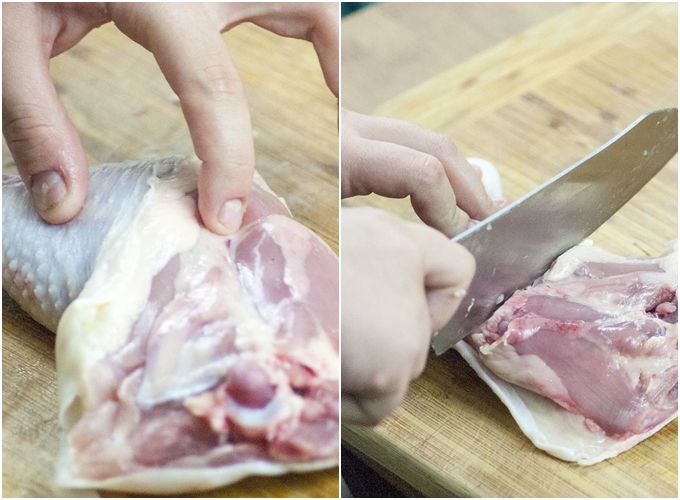 Với chiếc đùi vừa được tách ra, bạn dùng dao cắt đôi ngay khớp xương. Tách xương ở phần bắp đùi làm món gà rút xương còn đùi dưới dùng để hầm, chiên tùy ý.