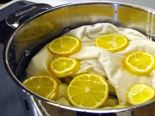Giặt quần áo với xà phòng như thông thường, xả nước nhiều lần cho sạch hẳn xà phòng sau đó vắt thật khô, cho nước cốt chanh vào những vết bẩn và chà xát nhiều lần. Tiếp thep cho quần áo trắng vào ngâm trong thau nước ấm đã hòa sẵn một bát giấm trong 3-4h sau đó xả lại với nước hoặc giặt lại với bột giặt rồi xả với nước xả cho thơm quần áo.
