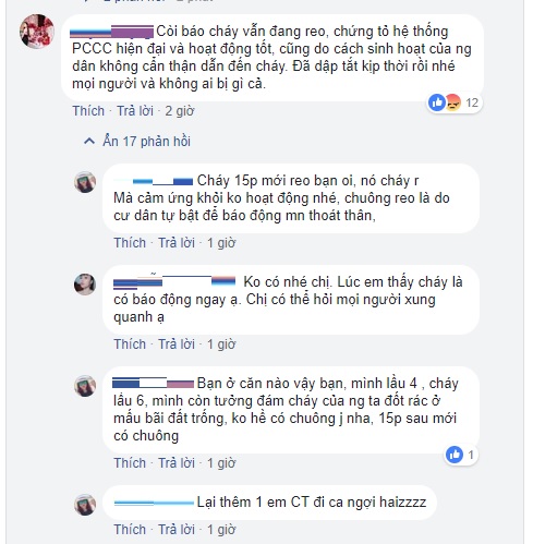 Người dùng Diep Hoang chia sẻ: "Mình lầu 4, cháy lầu 6, mình còn tưởng đám cháy của người ta đốt rác ở mấy bãi đất trống, không hề có chuông gì cả, 15 phút sau khi cháy mới có chuông".