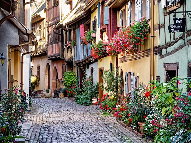 Thật sai lầm khi cho rằng Eguisheim vì thiếu nét quyến rũ tự nhiên mà phải dùng vẻ đẹp của hoa để trang trí. Được xây dựng từ năm 1257, ngôi làng sở hữu những con đường xoáy đồng tâm lát đá quyến rũ, những ngôi nhà với lối kiến trúc mặt tiền kết cấu gỗ lát và tất nhiên muôn sắc hoa nở rộ trước cửa mỗi ngôi nhà.