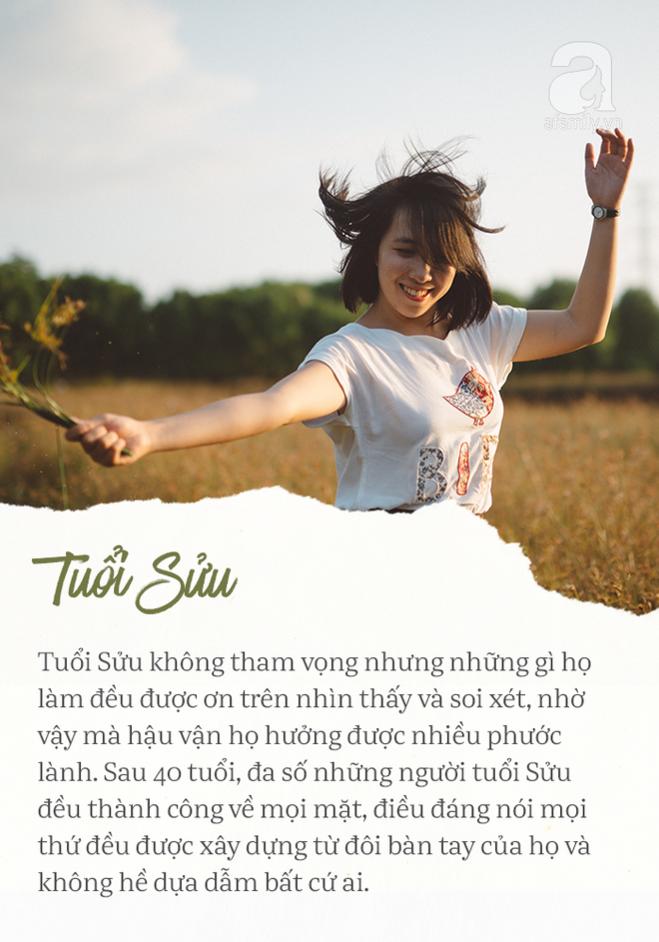 Tuổi Sửu không tham vọng nhưng những gì họ làm đều được ơn trên nhìn thấy và soi xét, nhờ vậy mà hậu vận họ hưởng được nhiều phước lành. Sau 40 tuổi, đa số những người tuổi Sửu đều thành công về mọi mặt, điều đáng nói mọi thứ đều được xây dựng từ đôi bàn tay của họ và không hề dựa dẫm bất cứ ai. Đàn ông nào có vợ tuổi Sửu thì phúc đức 3 đời, họ không những biết lo cho gia đình mà còn khiến gia đình hạnh phúc, an yên.