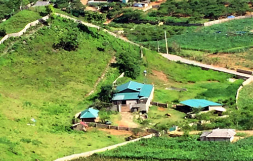 Theo quan sát của PV VNE, để đi vào bản Tà Dê phải băng qua nhiều nương ngô và cánh rừng. Từ trên đỉnh núi cao nhìn xuống, nhà của Thuận lợp mái tôn xanh, nằm lọt thỏm trong khuôn viên nửa quả đồi, tường rào cao.