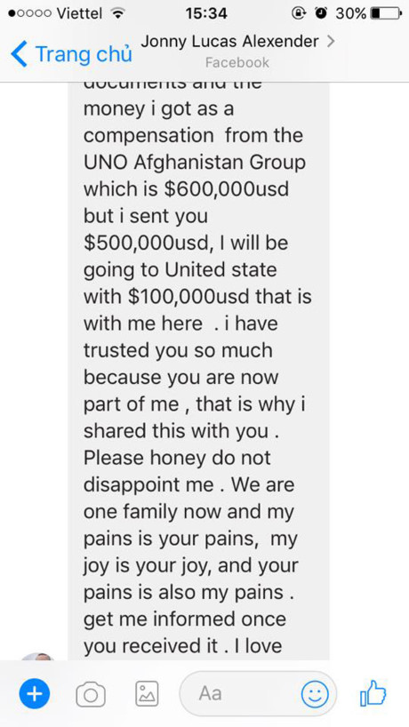 Sau mấy ngày không nhắn tin cho mình, hắn nhắn lại với nội dung đang gặp nguy hiểm ở đất nước này và sẽ không biết có thể bị chết bất cứ lúc nào. Xong hắn hỏi có thể tin tưởng mình được không, muốn gửi tất cả giấy tờ riêng tư và cả tiền coi như là tiền bồi thường của Tổ chức Liên Hiệp Quốc khoảng 500.000 USD (hơn 10 tỷ đồng).