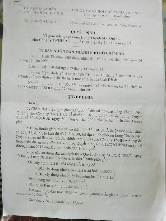 Ông Nguyễn Hữu Tín ký Quyết định 3066/QĐ-UBND về việc “giao đất tại Long Thạnh Mỹ, Quận 9 cho Công ty TNHH A Sung để thực hiện dự án khu dân cư 7/5”