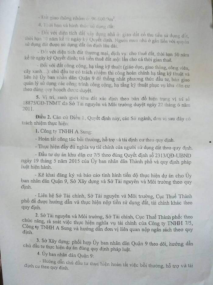 Ông Đua giao đất cho doanh nghiệp xong, gần 3 năm sau, ngày 25.4.2007, UBND Quận 9 mới ban hành Quyết định 291/QĐ-UBND về việc “Phê duyệt phương án bồi thường, hỗ trợ thiệt hại và tái định cư trong dự án đầu tư xây dựng khu nhà ở tại phường Long Thạnh Mỹ, Quận 9 do công ty 7/5 làm chủ đầu tư”. Quyết định 291/QĐ-UBND nêu rõ: Phê duyệt phương án bồi thường, hỗ trợ và tái định cư (phương án số 03/PABT-HĐBT ngày 19.4.2007); Do đây là dự án không sử dụng vốn ngân sách nhà nước, giao Hội đồng bồi thường Giải phóng mặt bằng trao đổi với chủ đầu tư để có mức hỗ trợ thêm cho các hộ dân tương đối phù hợp với các dự án khác gần kề.
