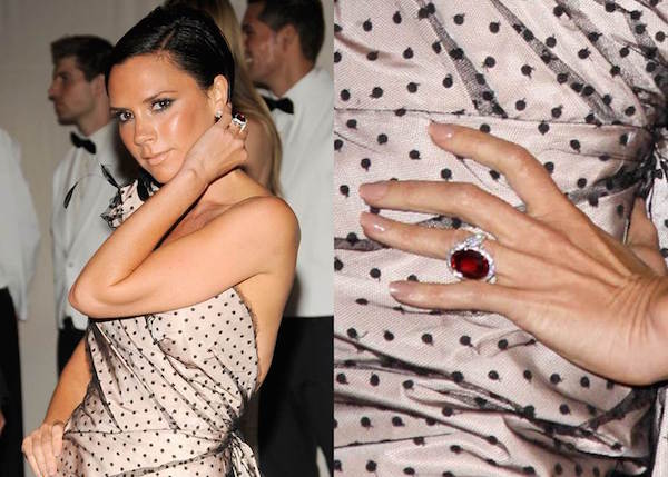 Viên ruby khổng lồ dát kim cương trên tay bà Beck năm 2009 được khen ngoiwcj bởi thiết kế tinh xảo tạo nên vẻ lung linh, tô điểm cho nét quý phái, sang trọng của Victoria. Chiếc nhẫn có giác 800.000 bảng Anh (khoảng 24 tỷ đồng).