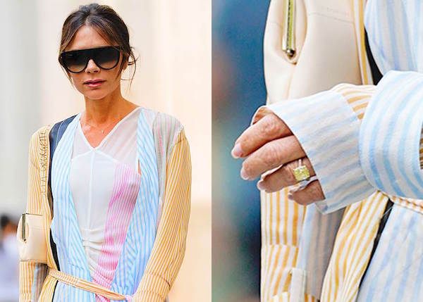 Và gần đây nhất, bà Beck dạo phố New York với chiếc nhẫn mới toanh trên ngón áp út. Đó là một món trang sức gần giống với chiếc nhẫn năm 2016 về kiểu dáng, tuy nhiên lại mang sắc vàng chủ đạo.