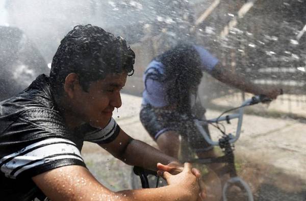 Dưới thời tiết oi ả, trẻ em làm mát dưới vòi cứu hỏa được mở ở Brooklyn, New York, Mỹ vào ngày 2/7/2018. Ảnh: Shannon Stapleton
