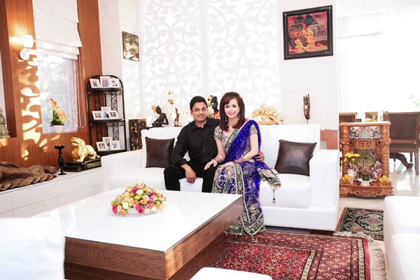 Diệu Hoa và chồng chụp tại phòng khách của gia đình