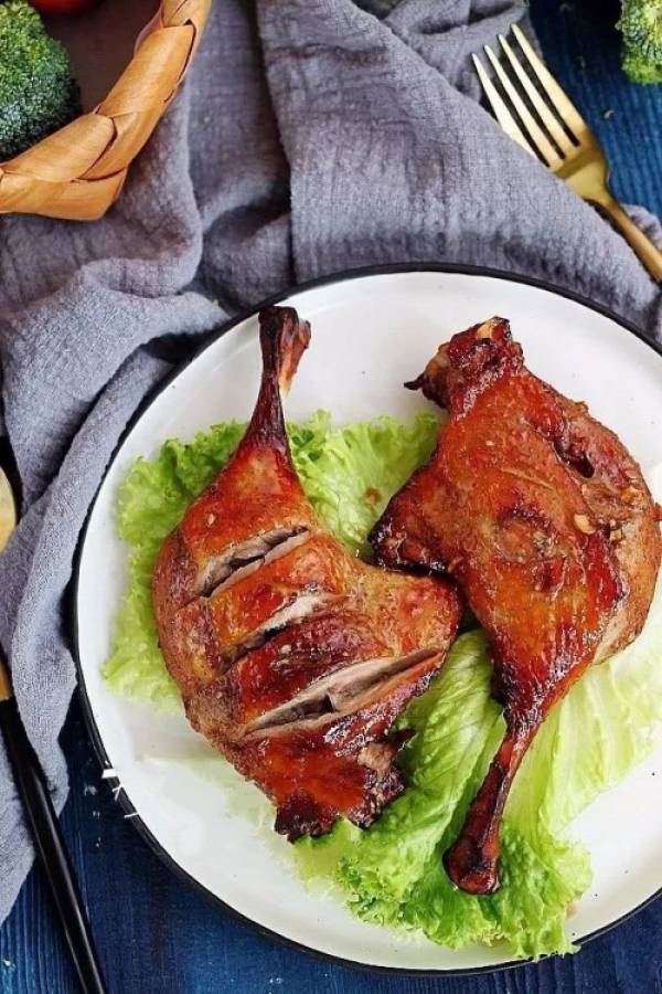 Đùi vịt rửa sạch, dùng dao cứa vài đường trên chiếc đùi. Đặt đùi vịt vào bát, thêm tỏi gừng băm nhỏ và rượu gạo vào, Thêm dầu hào, bột thì là, hạt tiêu và 15ml