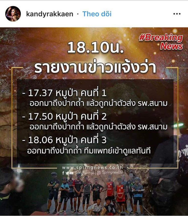 Khoảng 19h20, cậu bé thứ 4 trong đội bóng đã ra đến cửa hang. Hai cậu bé khác đã đến hang lớn số 3, đài Spring News của Thái Lan cho biết. Từ đây, các em có thể đi bộ để ra khỏi hang Tham Luang.