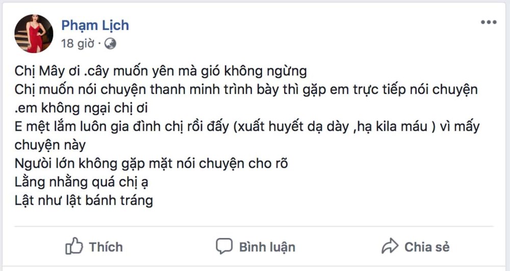 Mới đây trên trang cá nhân của mình, vũ công Phạm Lịch đã chia sẻ dòng status khá bức xúc nói với vợ nam ca sĩ Phạm Anh Khoa, chị Thuỳ Trang. Theo đó Phạm Lịch viết: “Chị Mây ơi, cây muốn yên mà gió không ngừng. Chị muốn nói chuyện thanh minh trình bày thì gặp em trực tiếp nói chuyện. Em không ngại chị ơi. Em mệt lắm luôn gia đình chị rồi đấy (xuất huyết dạ dày, hạ kila máu) vì mấy chuyện này. Ngưòi lớn không gặp mặt nói chuyện cho rõ, lằng nhằng quá chị ạ. Lật như lật bánh tráng”.