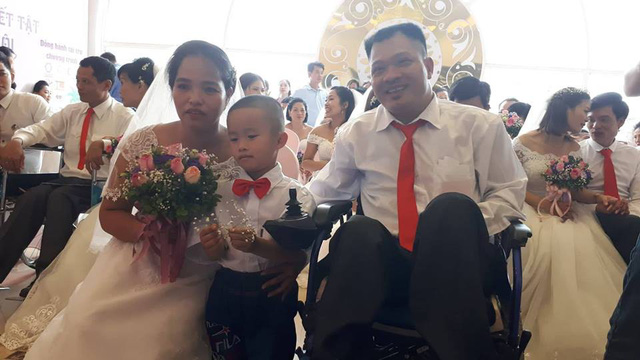 Anh Tiến cho biết, hai anh chị mới chỉ làm đăng ký kết hôn. Cách đây 6 năm, chị Thi đẩy anh đi xe lăn lên tận trung tâm huyện để chụp một tấm ảnh cưới lưu niệm vào ngày 14/2. Sau đó, chị Thi lại đẩy anh về UBND xã để làm thủ tục đăng ký kết hôn. Quãng đường khoảng 10km đi bộ ấy là kỉ niệm đáng nhớ với vợ chồng anh chị. Anh vẫn luôn ao ước có một đám cưới thực sự để bù đắp cho hi sinh của vợ. Cho đến ngày 23/6/2018 vừa qua, anh chị mới được tổ chức đám cưới đúng nghĩa khi được có mặt trong sự kiện đám cưới tập thể dành cho 40 cặp đôi khuyết tật tổ chức tại Hà Nội. Ngồi trên chiếc xe lăn bên cạnh người vợ của mình, anh Tiến nghẹn ngào hạnh phúc. Trên khuôn mặt rạng rỡ của anh ánh lên niềm tin về tình yêu, cuộc sống mới.