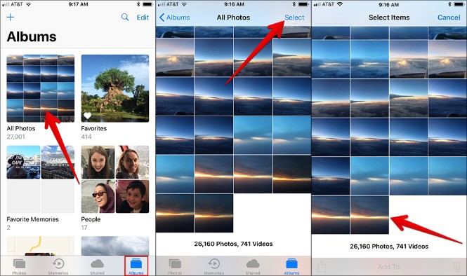 Mở ứng dụng Photos, trên tab Album chọn thư mục All Photos. Bạn sẽ thấy một luồng của tất cả các bức ảnh với những hình ảnh gần đây nhất ở dưới cùng màn hình. Ở góc trên bên phải, nhấn vào tùy chọn Select.