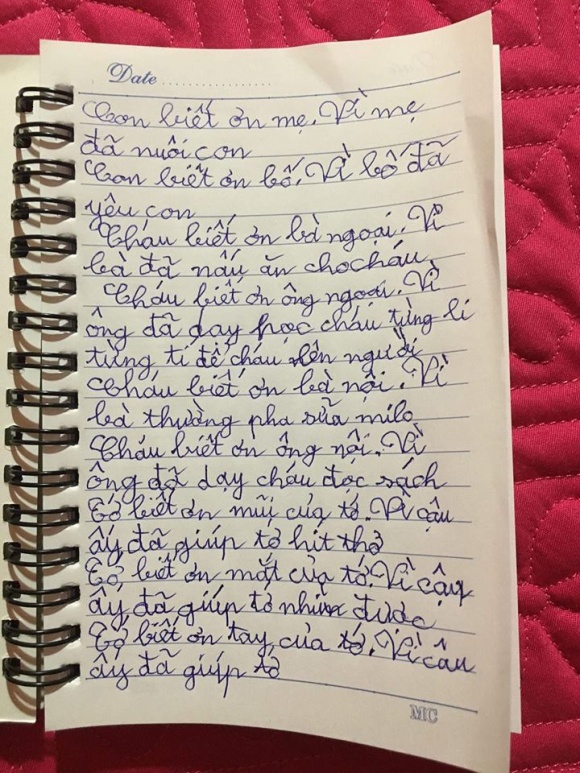 "Con biết ơn mẹ vì mẹ đã nuôi con. Con biết ơn bố vì bố đã yêu con. Cháu biết ơn bà ngoại vì bà đã nấu ăn cho cháu. Cháu biết ơn ông ngoại vì ông đã dạy học cho cháu từng li từng tí để cháu nên người"- bé Bin- con trai MC Thanh Vân Hugo viết.