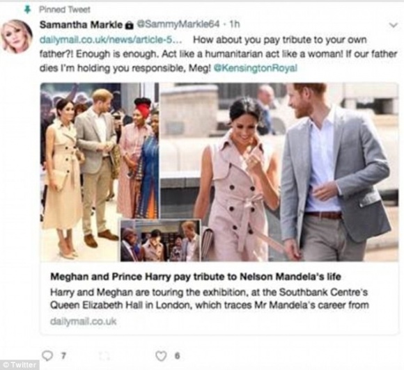 Không chỉ vậy 17/7 vừa qua khi báo giới đăng tải thông tin vợ chồng Công nương Meghan Markle cùng nhau tới dự triển lãm tri ân cựu Tổng thống Nam Phi. Ngay sau đó, Samantha Markle - người chị cùng cha khác mẹ của nữ Công tước xứ Sussex đã lấy link bài viết về lần xuất hiện này của em gái để làm minh họa cho phát ngôn mới của mình. Chị gái Công nương Meghan tiếp tục nói xấu em mình và gia đình Hoàng gia Anh. Trên trang Twitter, Samantha viết: "Thế có tri ân với cha ruột của mình không em? Quá đủ rồi. Hãy hành động như một người đi theo chủ nghĩa nhân đạo, hành động như một người phụ nữ. Nếu cha có mệnh hệ gì thì người phải chịu trách nhiệm là em đó Meg".