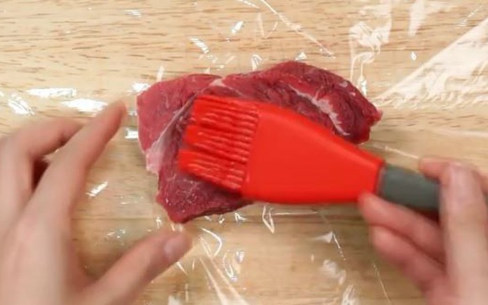- Dùng cọ nhúng vào dầu ăn hoặc dầu ô liu rồi quét lên lát thịt bò. Nhớ quét đều cả hai mặt nhé. Dầu chính là thành phần giúp độ ẩm không bị thoát ra để thịt bò vẫn mềm ngon sau một thời gian bảo quản.