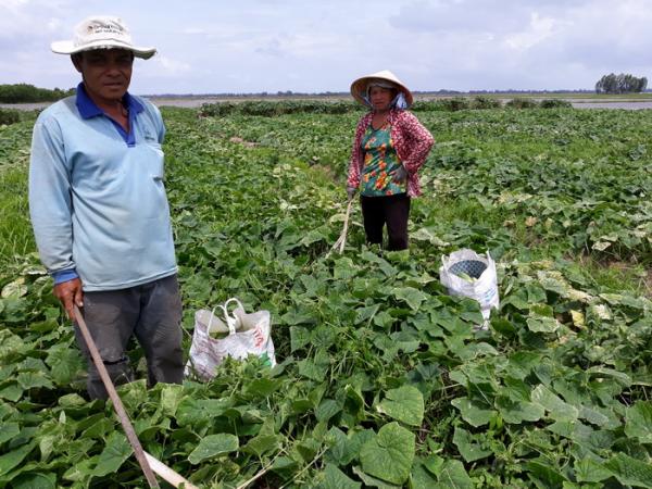 Vợ chồng chị Võ Thu Trang, ngụ xã Thường Phước 2, huyện Hồng Ngự (Đồng Tháp), cho biết vừa thua lỗ liên tiếp 2 vụ hoa màu trước đó nên vụ này canh tác lại vụ bí rợ với hy vọng gỡ gạc lại vốn. Tuy nhiên bí mới vừa cho bông thì nước lũ từ thượng nguồn đổ về nhanh và đang đe dọa đến diện tích canh tác của chị.