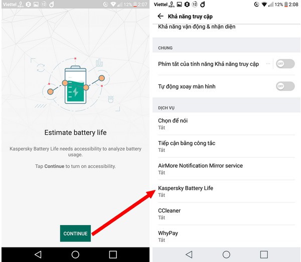 Trong lần đầu tiên sử dụng, bạn cần phải cấp quyền cho ứng dụng để Kaspersky Battery Life có thể vô hiệu hóa các ứng dụng chạy ngầm làm tiêu tốn pin trên smartphone. Nhấn nút “Continue” từ giao diện thiết lập hiện ra trong lần đầu chạy ứng dụng, tìm đến “Kaspersky Battery Life” ở danh sách sau đó.