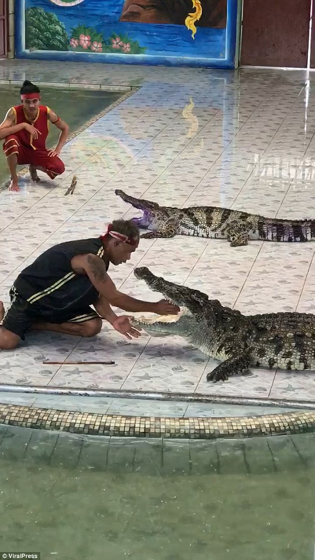 Khi đang trình diễn tiết mục xiếc cá sấu do chính mình huấn luyện, người đang ông bị chính con cá sấu này đớp vào cánh tay, máu chảy ròng ròng.