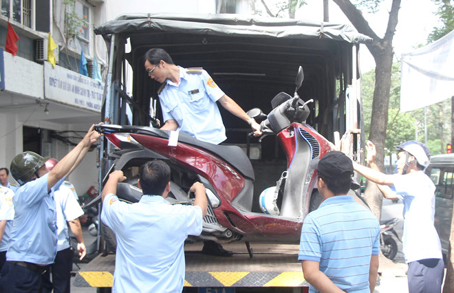 Nhiều xe dựng trên vỉa hè bị đưa về trụ sở. Ảnh: Lê Trai.