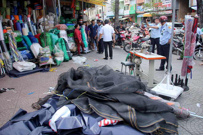 Đoàn liên ngành quận 1 tiếp tục di chuyển đến khu vực chợ Dân Sinh (phường Nguyễn Thái Bình). Tại đây, nhiều tiểu thương bày hàng hóa chiếm hết vỉa hè.