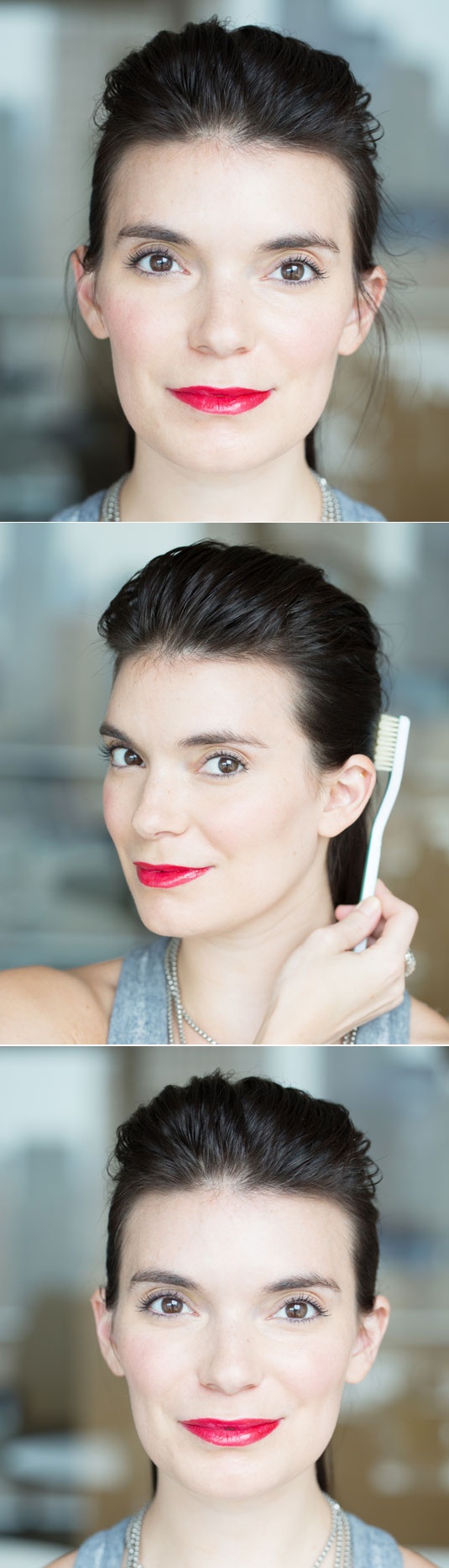 Phái đẹp thường gặp rắc rối khi buộc hoặc búi tóc bởi những sợi tóc con rườm rà sẽ khiến mái tóc trở nên kém gọn gàng. Do đó, để khắc phục tình trạng này, bạn có thể xịt keo vào tóc con rồi dùng bàn chải đánh răng vuốt ngược lên để chúng vào nếp hiệu quả.