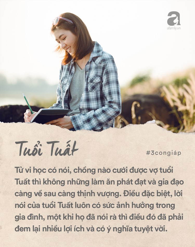 Tử vi học có nói, chồng nào cưới được vợ tuổi Tuất thì không những làm ăn phát đạt và gia đạo càng về sau càng thịnh vượng. Điều đặc biệt, lời nói của tuổi Tuất luôn có sức ảnh hưởng trong gia đình, một khi họ đã nói rà thì điều đó đã phải đem lại nhiều lợi ích và có ý nghĩa tuyệt vời. Vì vậy, chồng nên càng nghe lời vợ thì mới mong sự nghiệp thăng hoa rực rỡ, tài vận dồi dào.