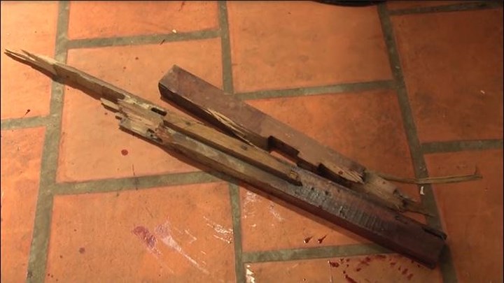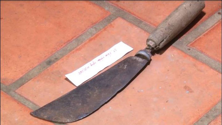 Khúc gỗ nghi phạm đánh chết cha mẹ ruột và con dao ở hiện trường