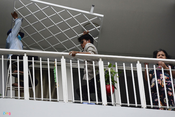 Hàng ngày, con cháu đi làm và đi học, bà cùng một vài người hàng xóm xuống tầng trệt tòa nhà ngồi trò chuyện và nghe ngóng tiến độ sửa chữa.