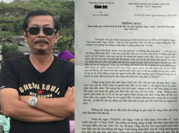 Một ảnh chụp thông báo nội bộ của tờ Tuổi Trẻ đề ngày 24 tháng 7 viết rằng, những bài ông Vinh cho đăng trên Facebook “có dấu hiệu thông tin không đúng sự thật, đưa thông tin xuyên tạc, vu khống, xúc phạm uy tín của tổ chức danh dự và nhân phẩm của cá nhân”. Đặc biệt bài mang tựa đề “Tổng bí thư phải là người miền Bắc có lý luận” bị cho là “có dấu hiệu đưa thông tin gây chia rẽ vùng miền, phá hoại khối đại đoàn kết dân tộc”.