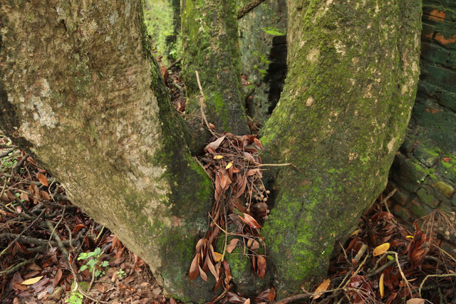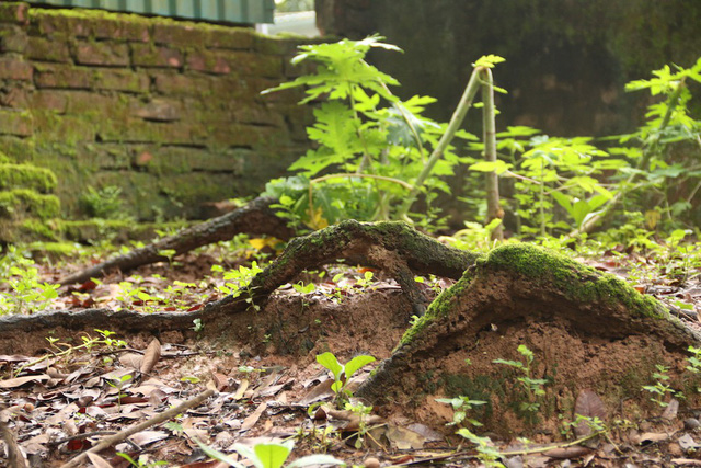 Xung quanh gốc cây có nhiều đoạn rễ nhô lên khỏi mặt đất.