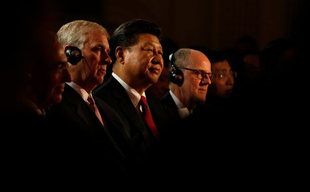 Chủ tịch Trung Quốc Tập Cận Bình cùng hoàng tử Andrew của Anh (thứ hai từ trái) tham dự một hội nghị ở Viện Khổng Tử tại London, tháng 10/2015 (Ảnh: AP)