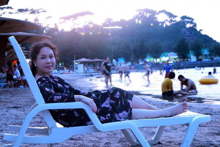Nữ nghệ sĩ chia sẻ đầy hài hước: “Cùng một bãi biển hai vợ chồng chụp hình lãng mạn, trong khi con gái lãng xẹt”.